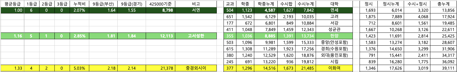 좀 더 확대해서 소위 '중경외시이'까지 확대해서 보면 2026 대입(현 고3) 기준으로 모집인원이 수시와 정시 모두 합해 39,111(논술 제외)명입니다. 내신이 관여되는 수시 모집인 교과와 학종만 합하면 21,485명입니다. 고1-1학기 내신을 기준으로 하면 6과목 중에 1등급이 4개이고 2등급이 2개인 라인입니다. 등급 평균으로 계산하면 1.33등급입니다.