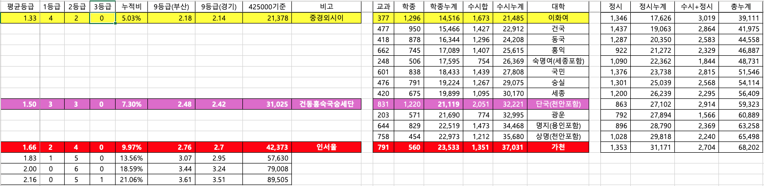 좀 더 확대해서 1등급이 3개이고 2등급이 3개인 평균등급 1.5등급 라인까지를 보면 누적인원으로 31,025명 선입니다. 수시 교과와 학종 인원으로 비교해보면 '국숭세단'라인입니다. 수시로만 대학에 간다면 정시를 30%로 줄여서 수시가 늘어난다고 해도 '광명상가' 수준입니다.