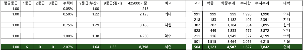 일단 고1-1학기 6과목(공통국어1/공통수학1/공통영어1/한국사1/통합사회1/통합과학1) 모두 1등급 인원을 보면 부산시 전체 81개 고교, 13,553명 중에 2.07%인 281명 선입니다. 경기도 57개교 15,566명을 분석한 결과 약 1.74% 학생만이 6과목 모두 1등급을 받았습니다. 서울은 더 적을 것으로 예상됩니다. 공식 발표된 두 자료만 가지고 현 고1 425,000명을 기준으로 인원을 추정해보면 고1-1학기 6과목 모두 1등급은 약 8,798명 정도로 추청할 수 있습니다. 이 인원을 수시전형 누적 인원으로 비교해보면 의대부터 연세대까지 교과전형과 학종의 누적 모집인원(2026학년도)과 일치합니다. 다시 말하면 6개 모두 1등급 받은 학생이 연세대 수시까지 진학이 가능할 것으로 예측된다고 생각하면 됩니다.